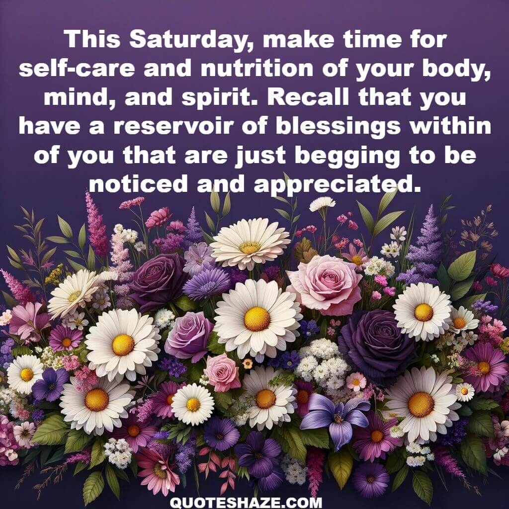 - This Saturday, make time for self-care and nutrition of your body, mind, and spirit. Recall that you have a reservoir of blessings within of you that are just begging to be noticed and appreciated.