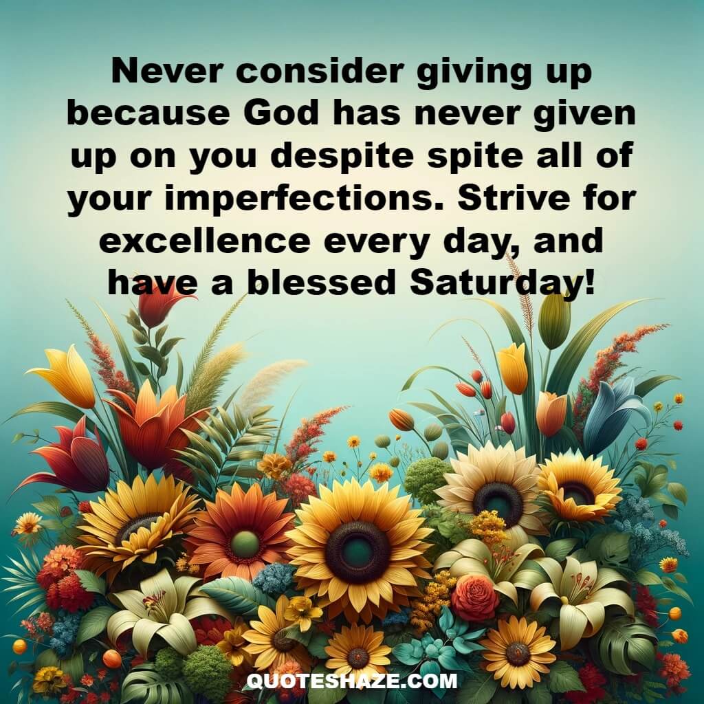 - Never consider giving up because God has never given up on you despite spite all of your imperfections. Strive for excellence every day, and have a blessed Saturday!