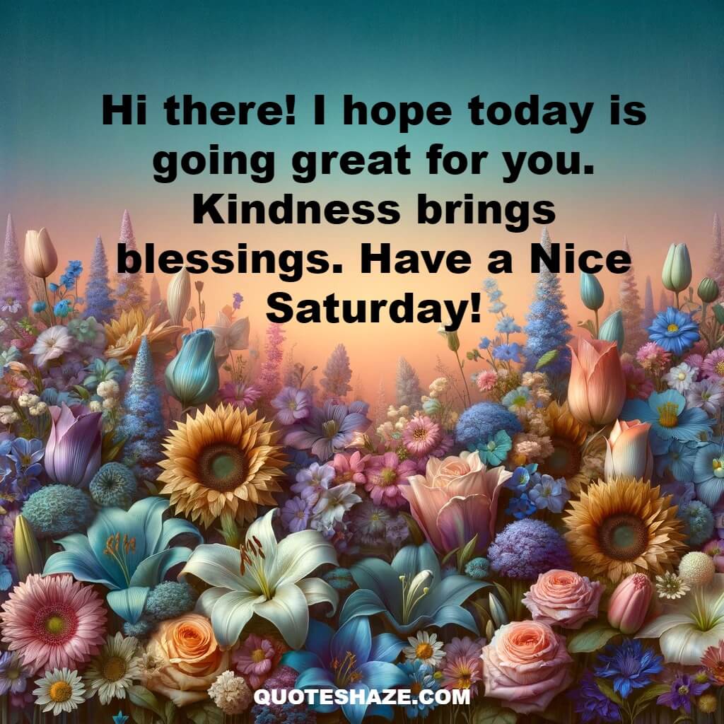 - Hi there! I hope today is going great for you. Kindness brings blessings. Have a Nice Saturday!