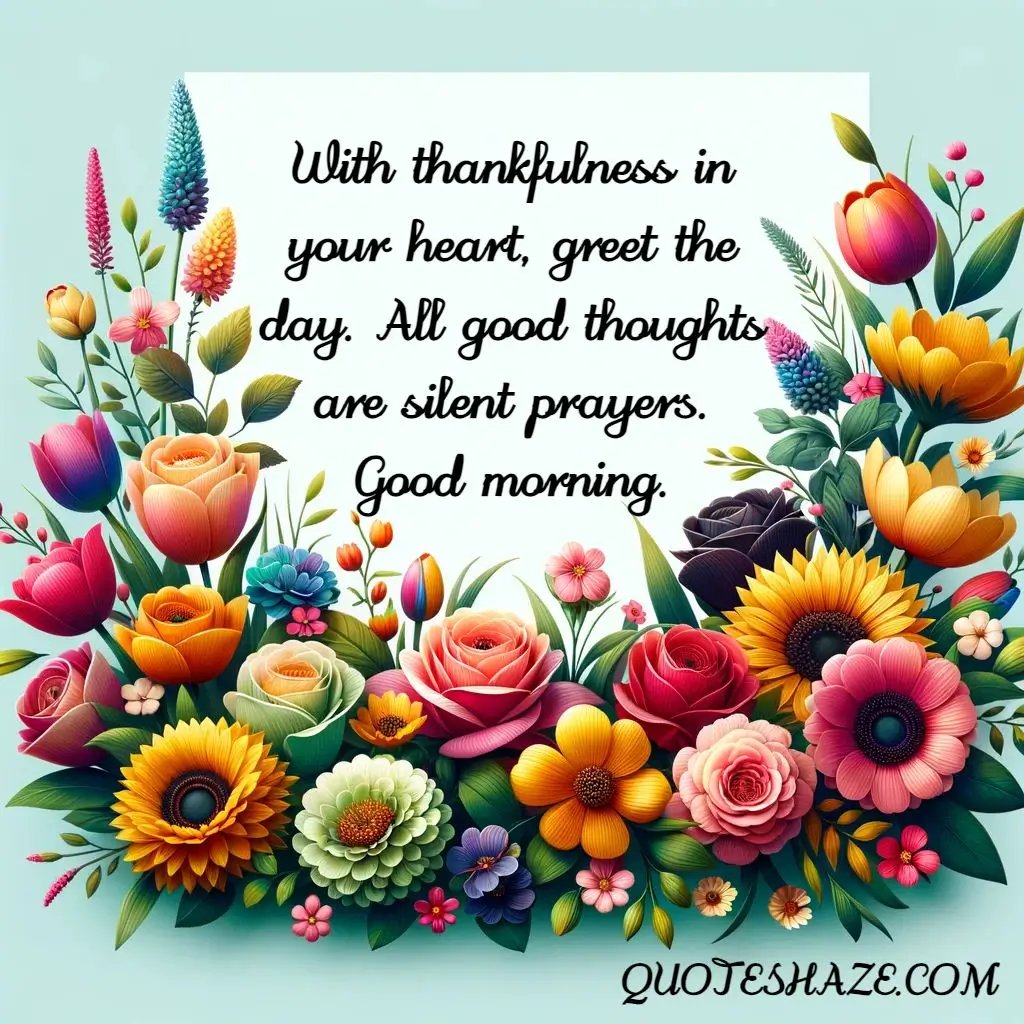 - With thankfulness in your heart, greet the day. All good thoughts are silent prayers. Good morning.