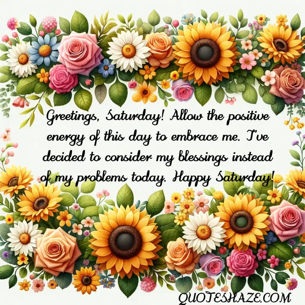 - Greetings, Saturday! Allow the positive energy of this day to embrace me. I’ve decided to consider my blessings instead of my problems today. Happy Saturday!