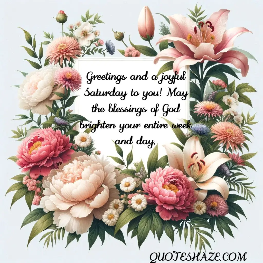 - Greetings and a joyful Saturday to you! May the blessings of God brighten your entire week and day.