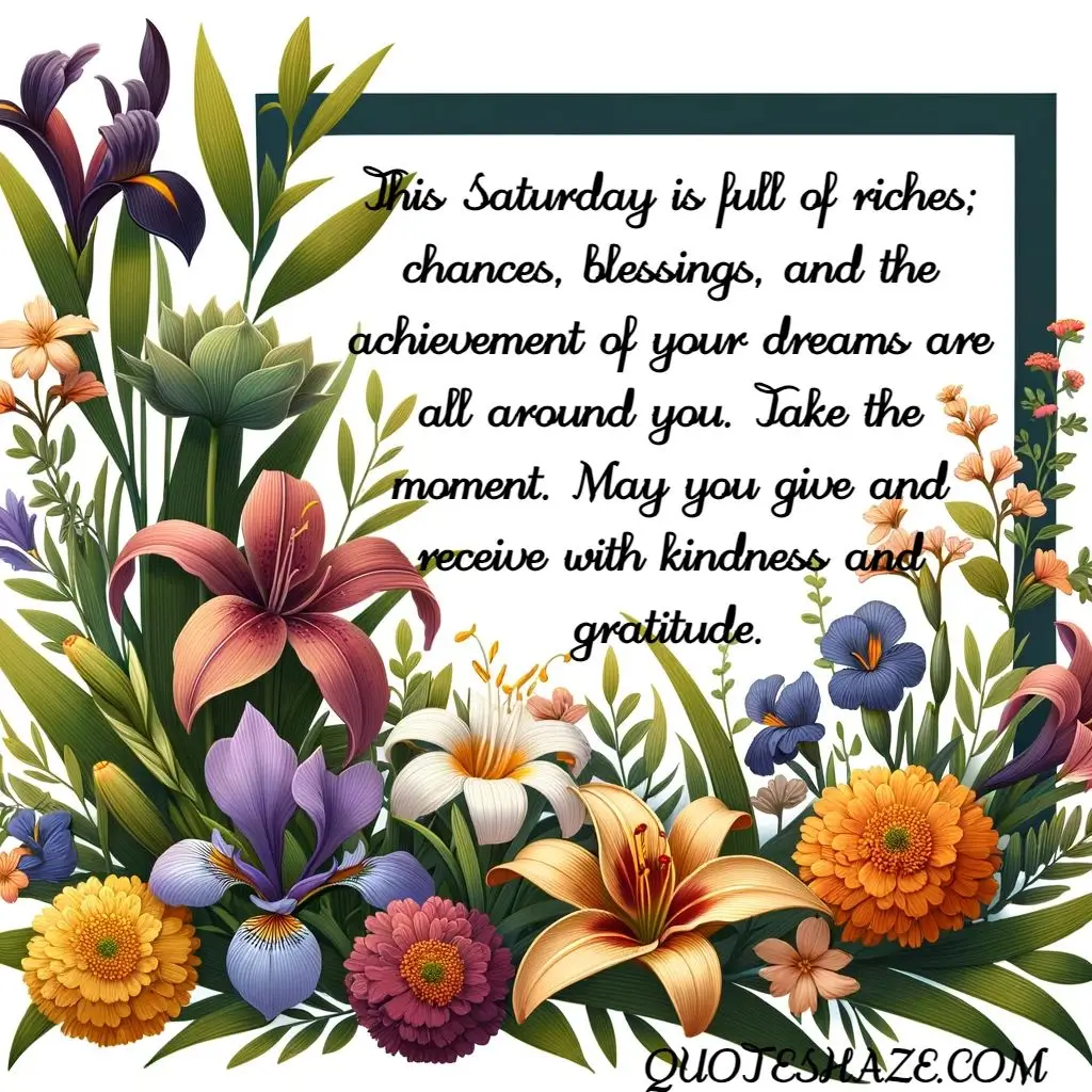 - This Saturday is full of riches; chances, blessings, and the achievement of your dreams are all around you. Take the moment. May you give and receive with kindness and gratitude.