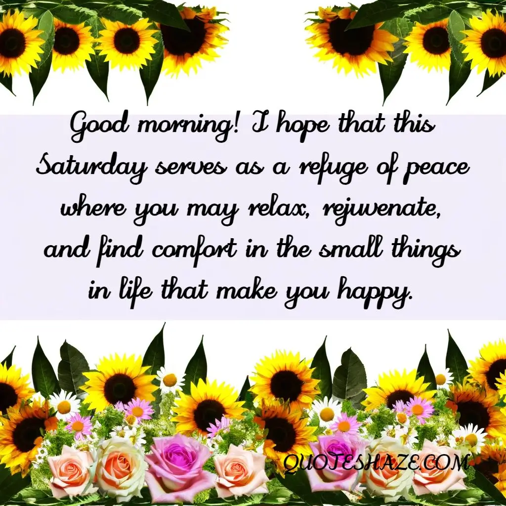 - Good morning! I hope that this Saturday serves as a refuge of peace where you may relax, rejuvenate, and find comfort in the small things in life that make you happy.