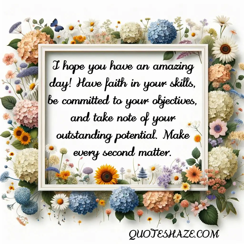 - I hope you have an amazing day! Have faith in your skills, be committed to your objectives, and take note of your outstanding potential. Make every second matter.