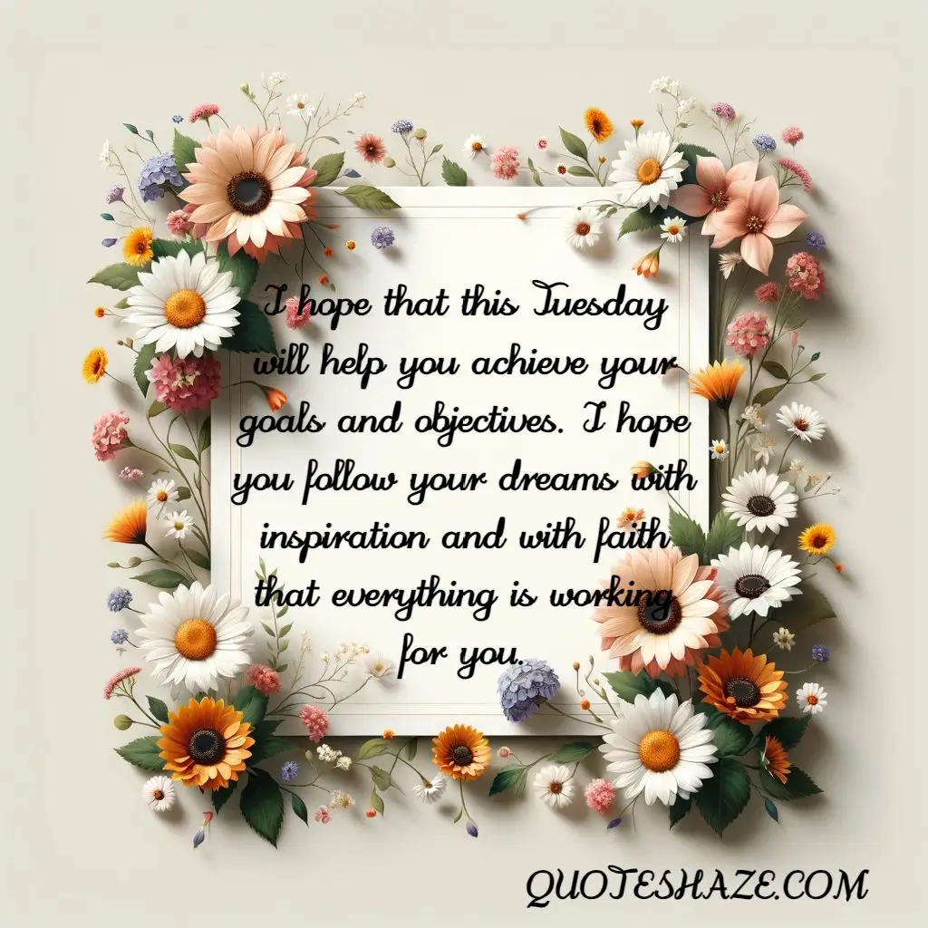 - I hope that this Tuesday will help you achieve your goals and objectives. I hope you follow your dreams with inspiration and with faith that everything is working for you.