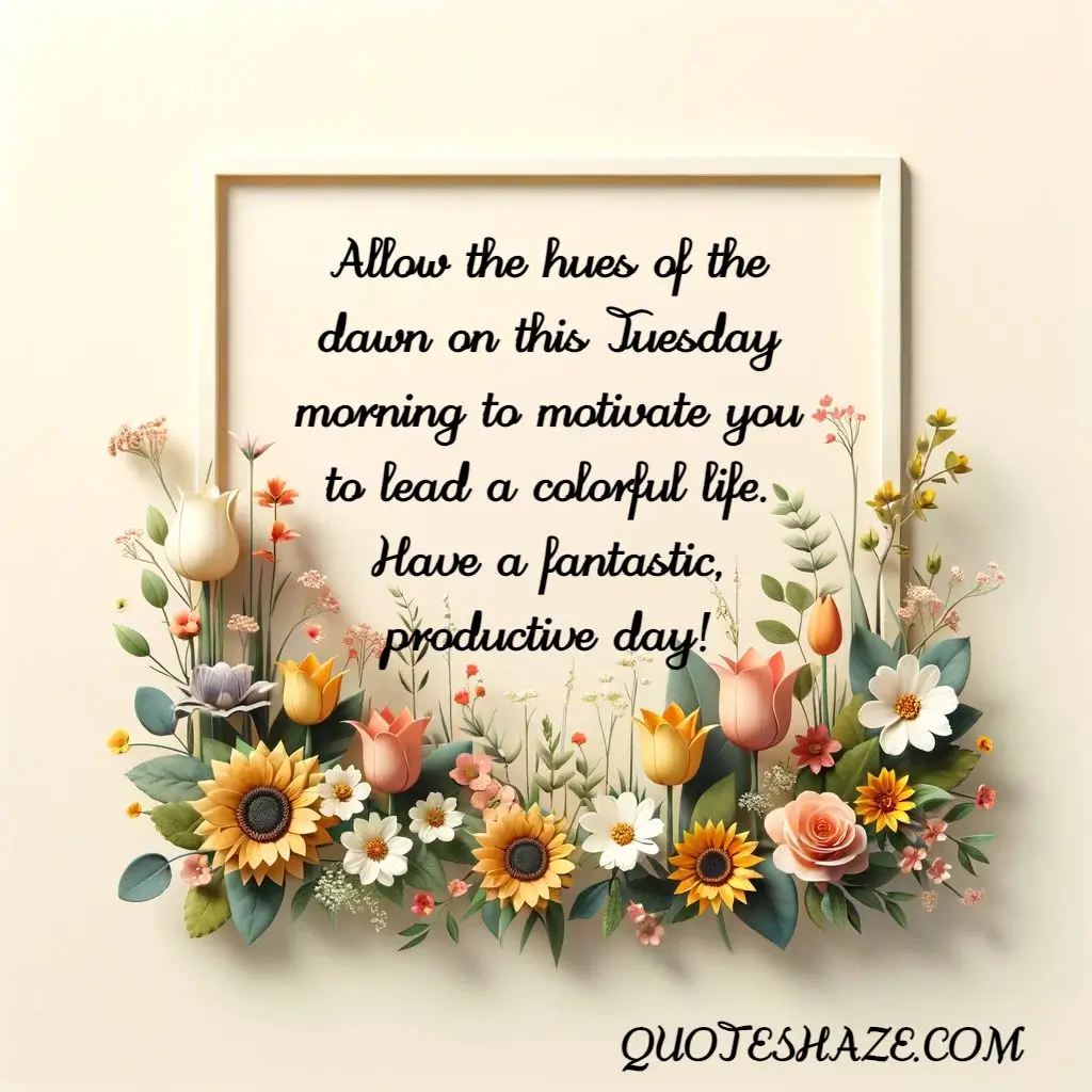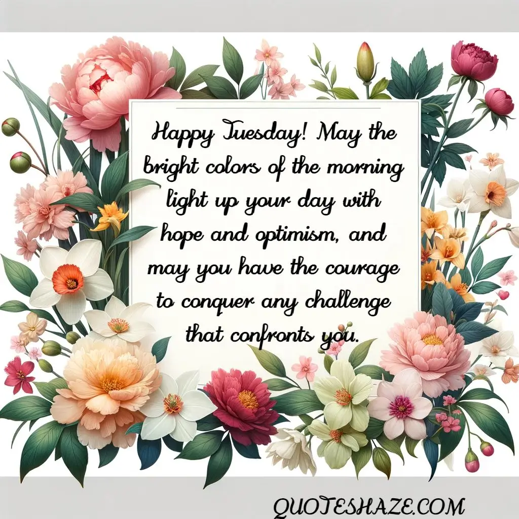 - Happy Tuesday! May the bright colors of the morning light up your day with hope and optimism, and may you have the courage to conquer any challenge that confronts you.