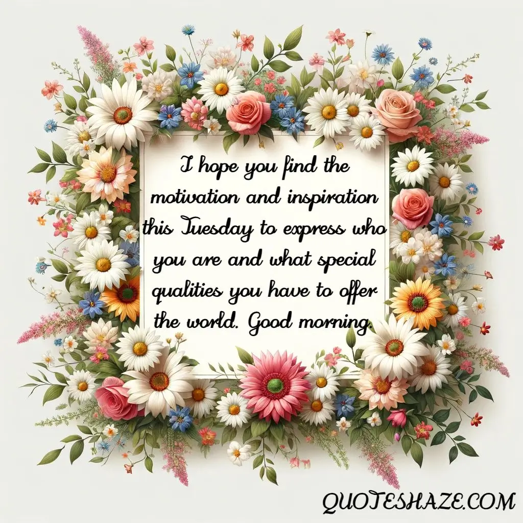 - I hope you find the motivation and inspiration this Tuesday to express who you are and what special qualities you have to offer the world. Good morning.