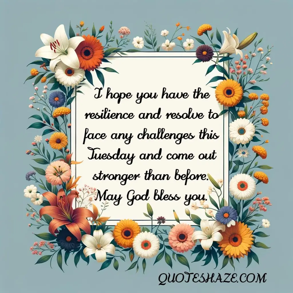 - I hope you have the resilience and resolve to face any challenges this Tuesday and come out stronger than before. May God bless you.