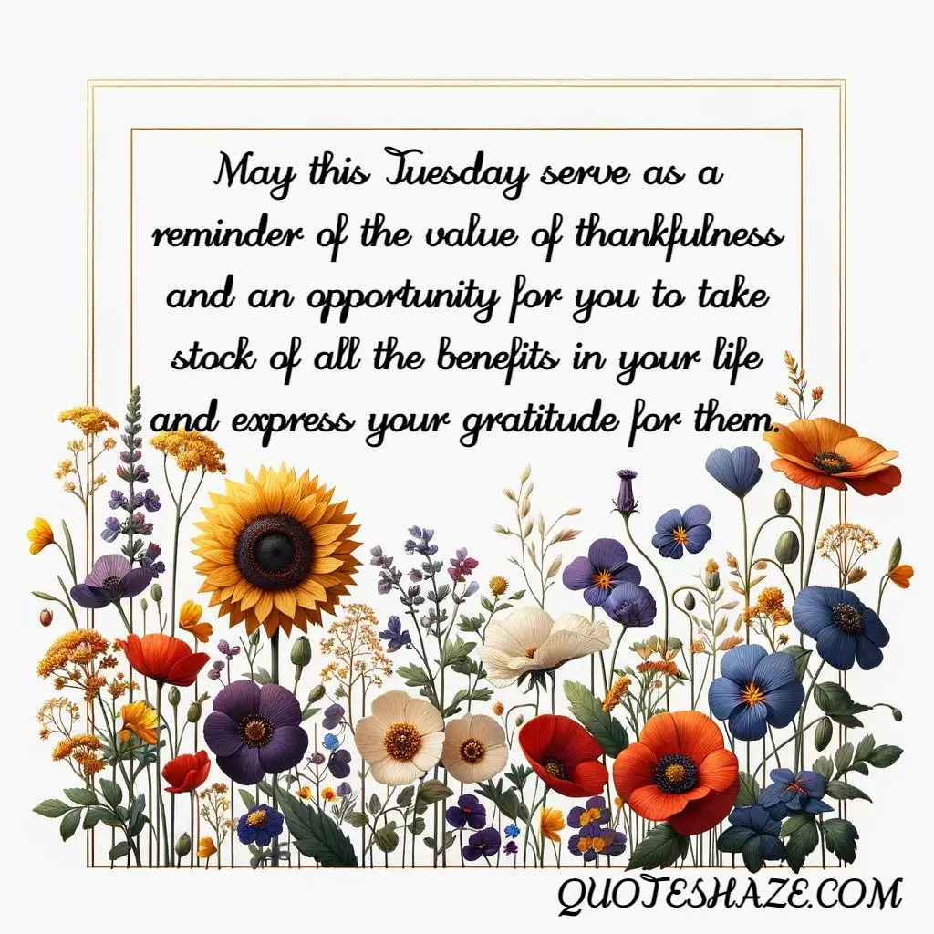 - May this Tuesday serve as a reminder of the value of thankfulness and an opportunity for you to take stock of all the benefits in your life and express your gratitude for them.