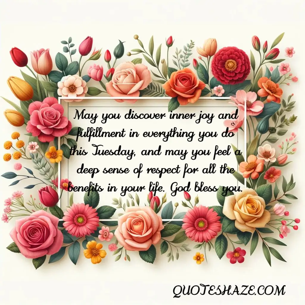 - May you discover inner joy and fulfillment in everything you do this Tuesday, and may you feel a deep sense of respect for all the benefits in your life. God bless you.