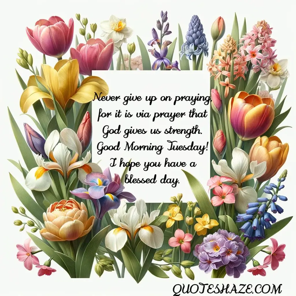 - Never give up on praying, for it is via prayer that God gives us strength. Good Morning Tuesday! I hope you have a blessed day.