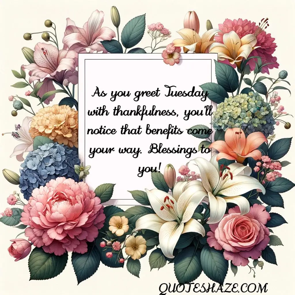 - As you greet Tuesday with thankfulness, you’ll notice that benefits come your way. Blessings to you!