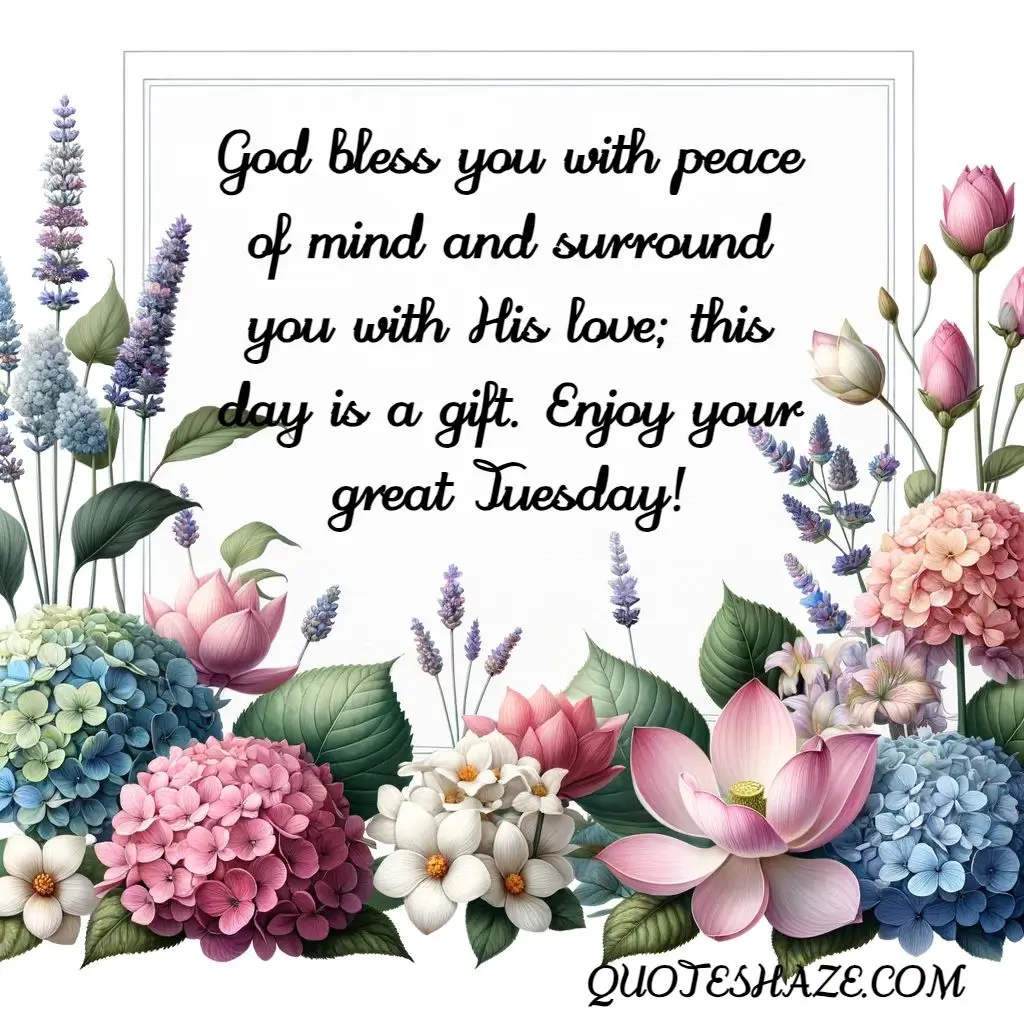 - God bless you with peace of mind and surround you with His love; this day is a gift. Enjoy your great Tuesday!