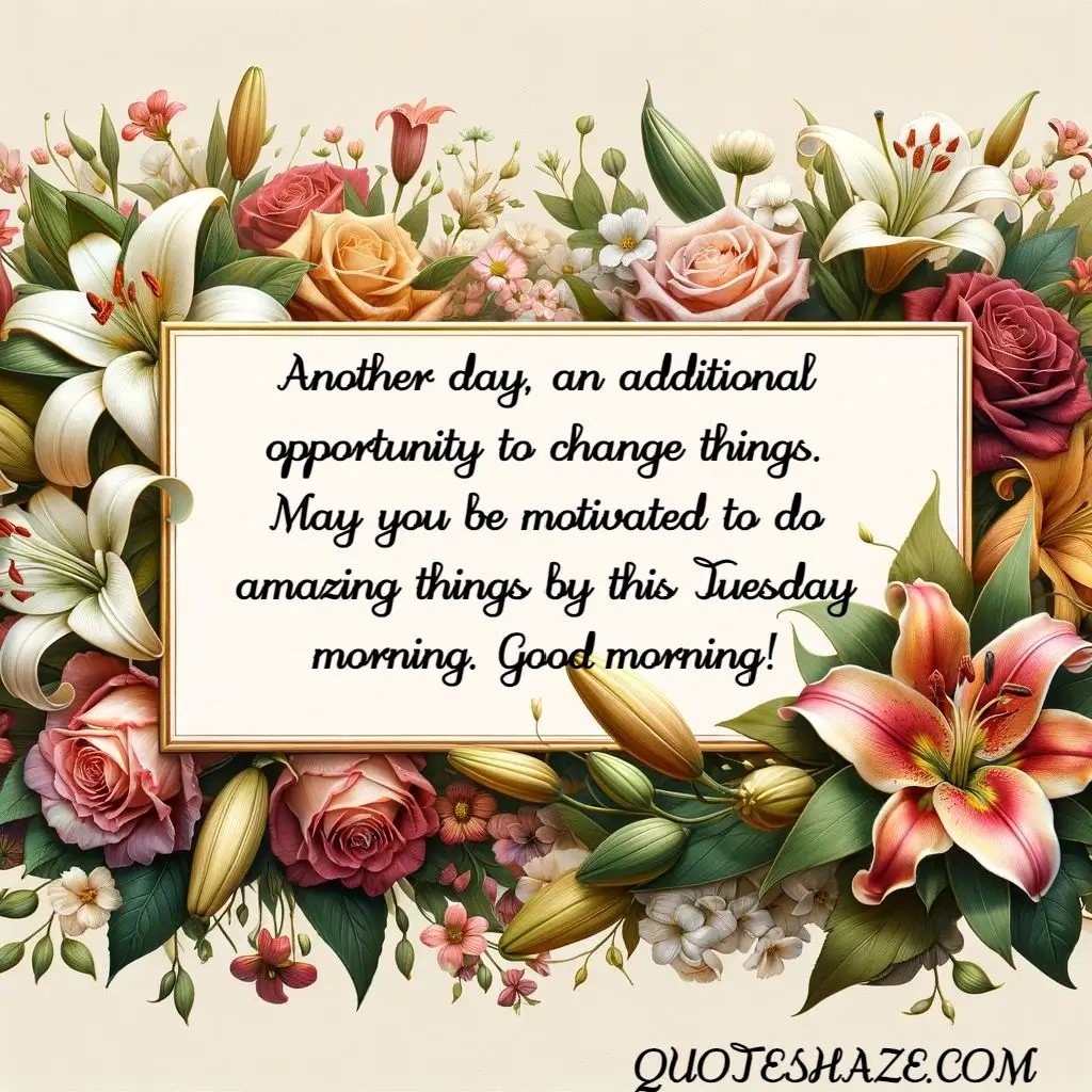 - Another day, an additional opportunity to change things. May you be motivated to do amazing things by this Tuesday morning. Good morning!