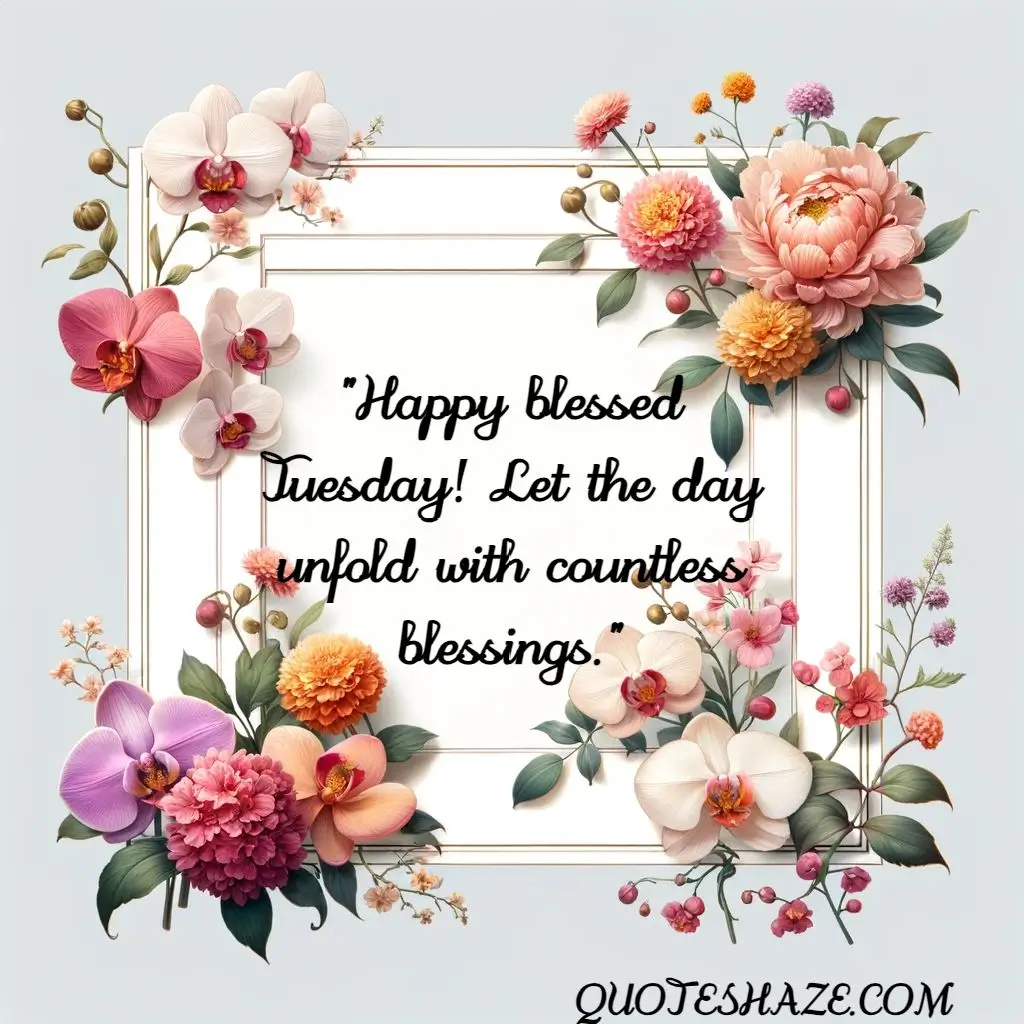 - “Happy blessed Tuesday! Let the day unfold with countless blessings.”